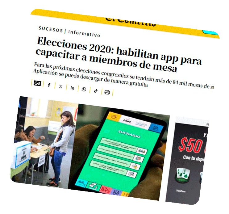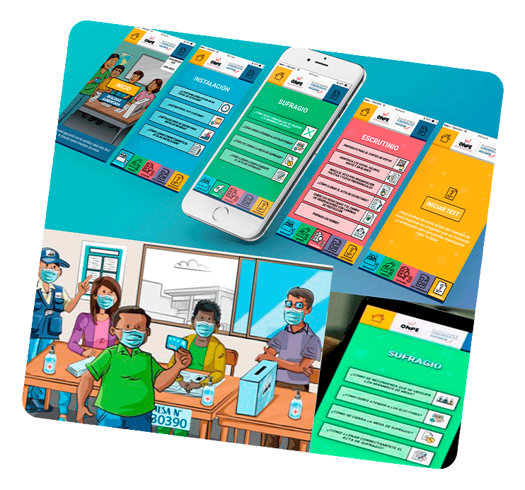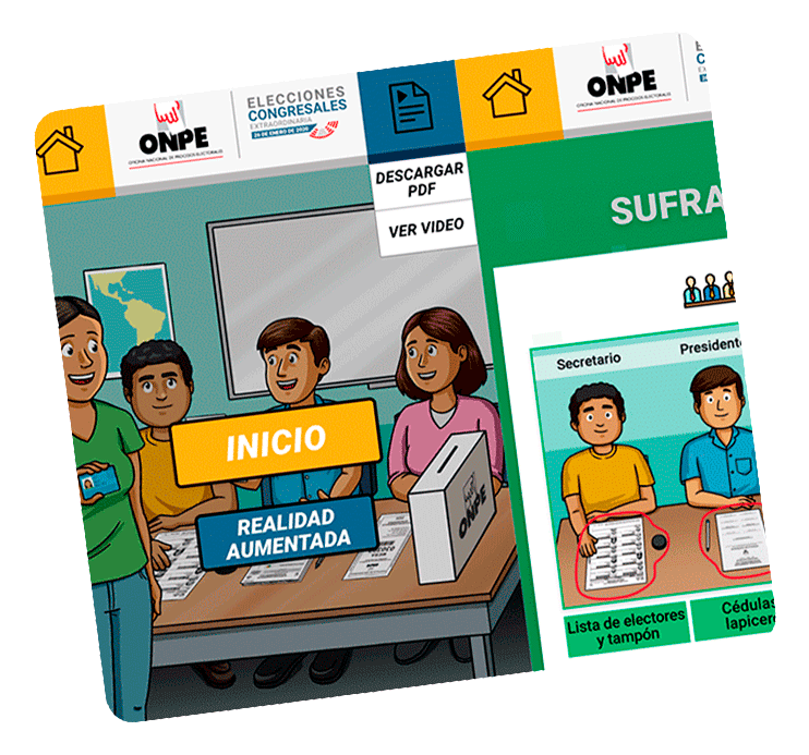 Diseñamos una aplicación móvil para las Elecciones Congresales Extraordinarias del 2020. La ONPE necesitaba agilizar el proceso de capacitación para los miembros de mesa en Perú y en el mundo, y con esta aplicación logramos que pudieran capacitarse por cuenta propia y de manera lúdica. La aplicación tenía un apartado de realidad aumentada donde también se podía interactuar con la cartilla física. No queremos aburrirlos, pero ¿saben qué? Gracias a este trabajo en tiempo récord, al alcance y a la importancia para el desarrollo de las elecciones democráticas en el Perú en 2020, también fuimos premiados en la XV Edición del Publifestival de España.
